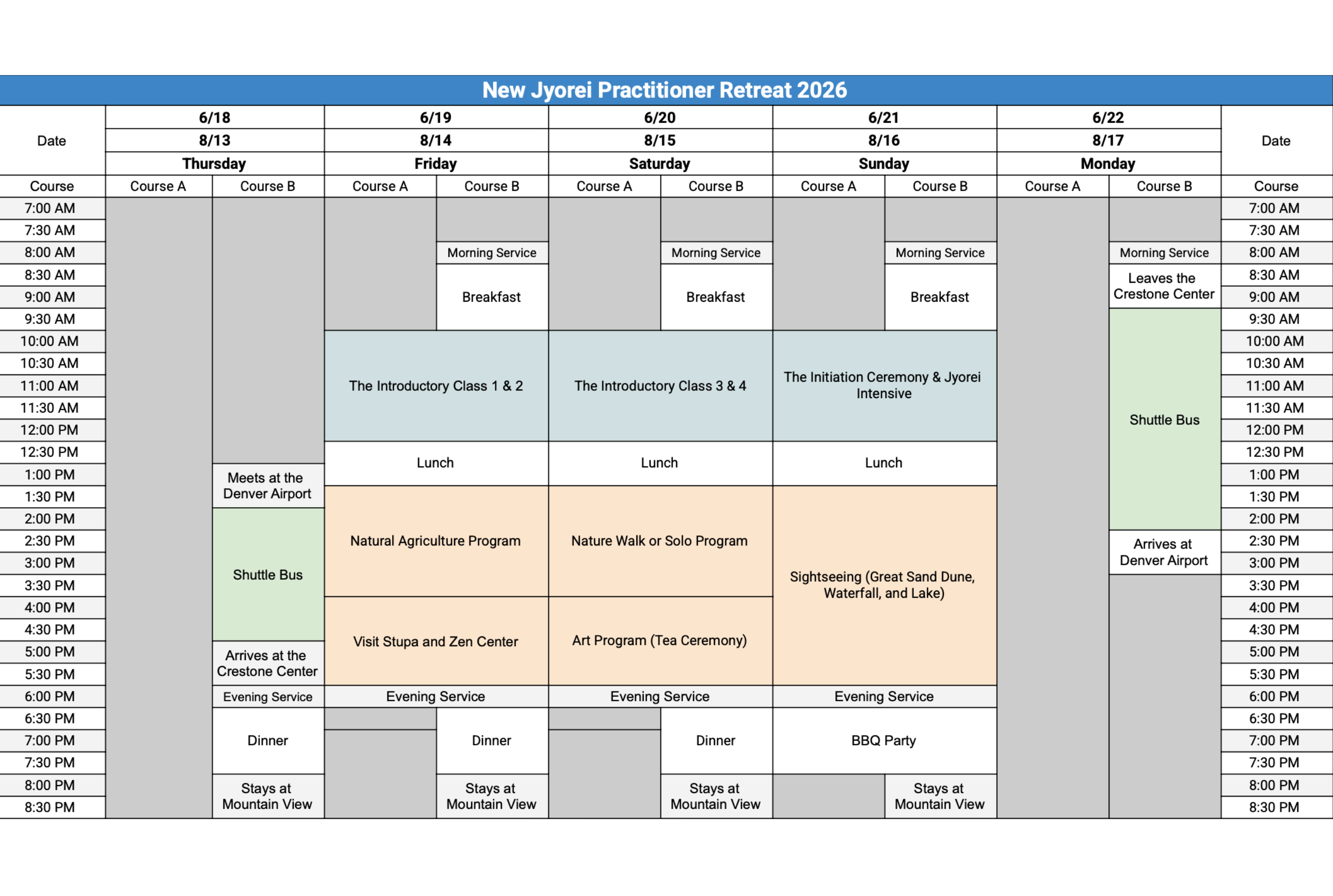 Activities include Introductory Classes, chanting, nature walk, Natural Agriculture, Art & Beauty, Initiation Ceremony, and Jyorei Intensive.
